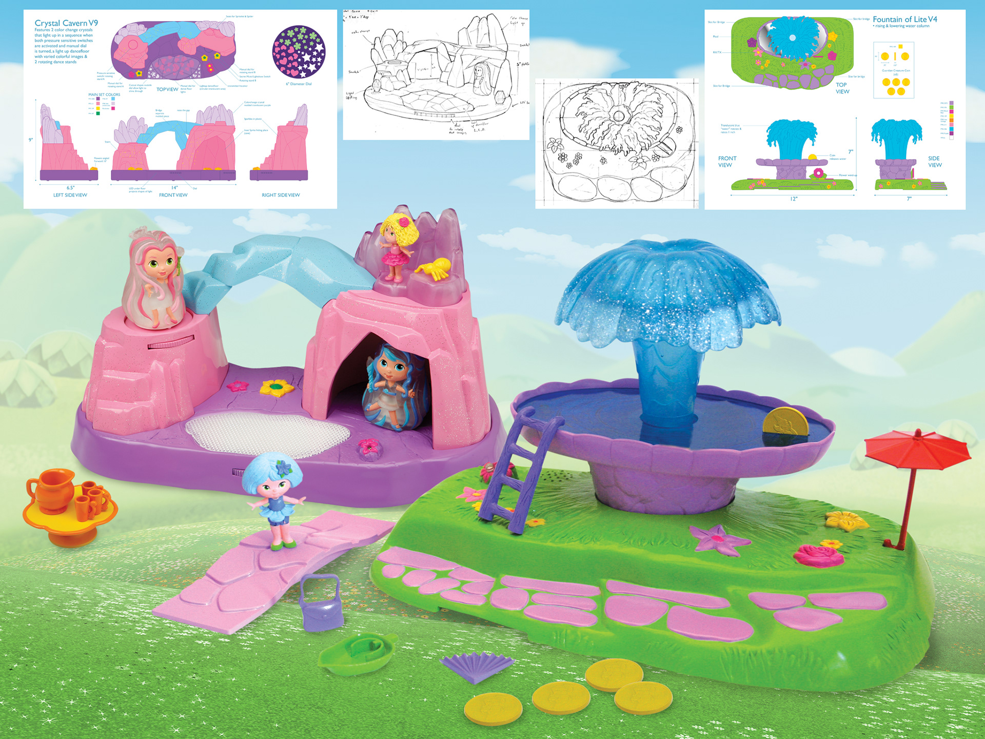 Playset designs for Lite Sprites line of color changing light up dolls.